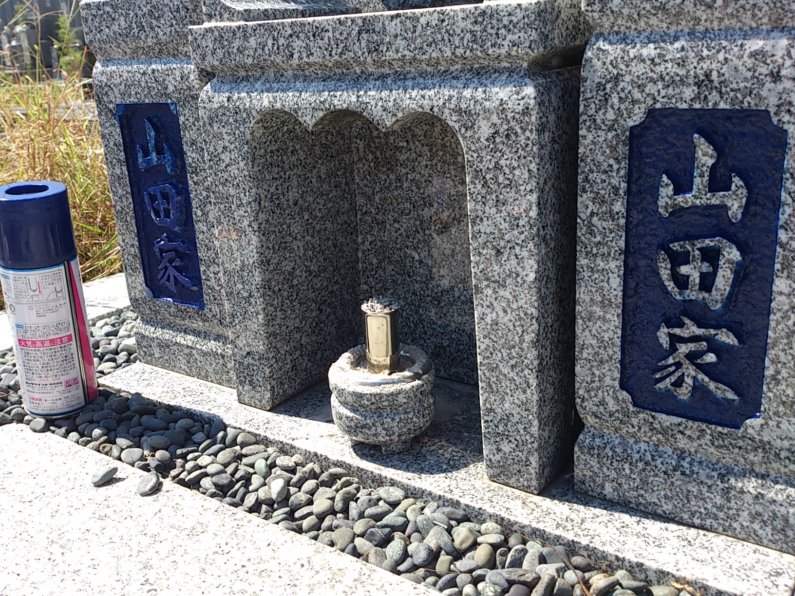 3年前に建立させていただいたお客様から「孫たちが墓参りに来て迷うことがないように家名のところへ色を入れてほしい」と依頼を受けて、早速作業してきました。