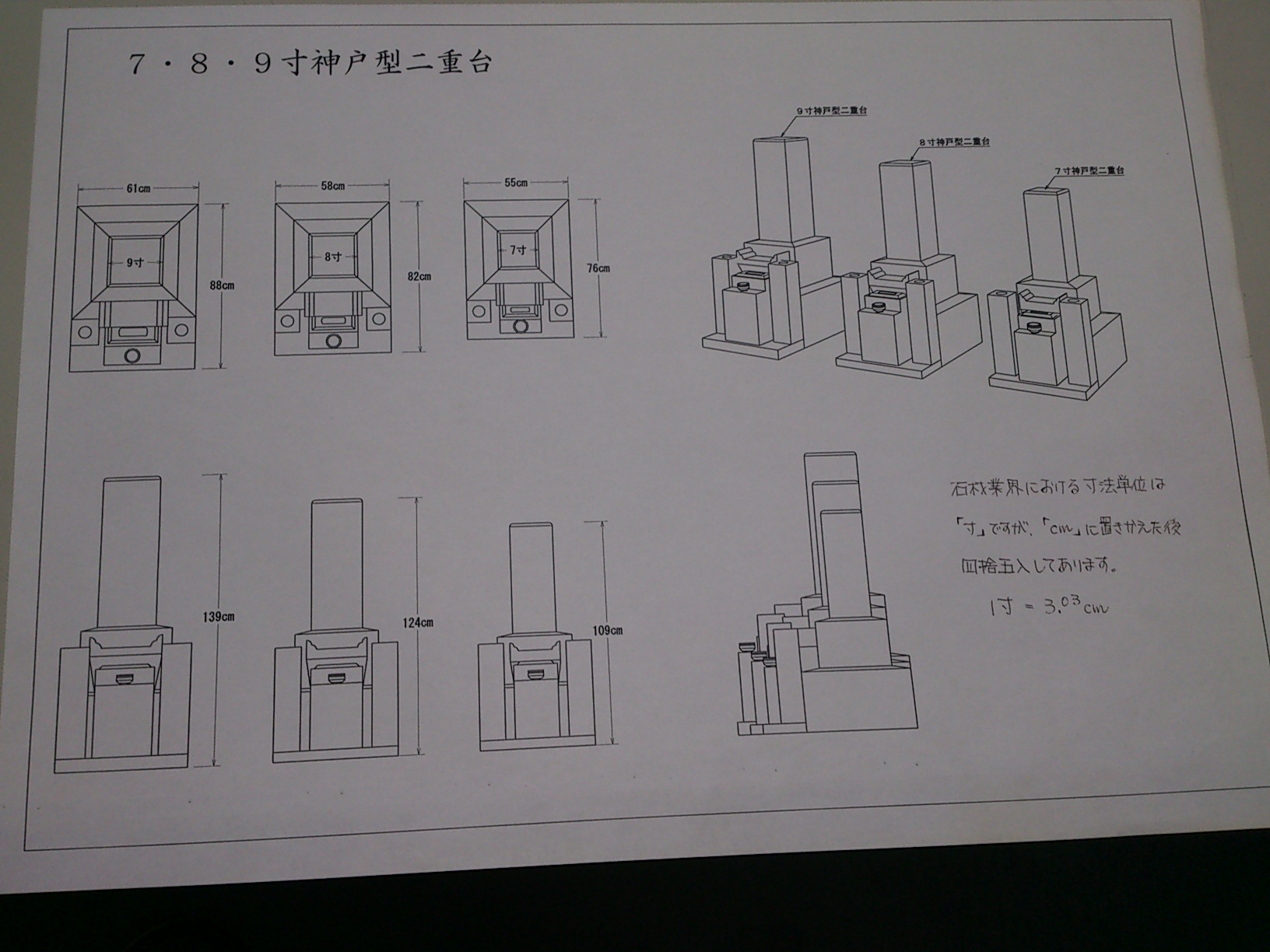 和型のお墓では、最上段の石(竿石)の幅で大きさを表しており、コレに合わせて台石や前の置物に規格寸法があります。9寸二重台の高さは139センチ、同様に8寸は124センチ、7寸は109センチです。竿石の幅が1寸変わると、高さは5寸(15 センチ)変わります。